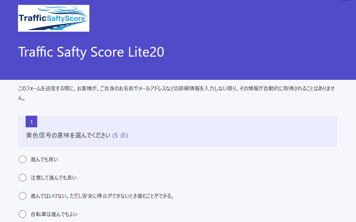交通ルールの理解度を深めるTraffic Safty Score (トラフィックセーフティスコア)を活用しています。道路標識や交差点の曲がり方、駐車禁止場所など、間違えたり勘違いしやすいルールの問題に特化していることも特徴の一つです。交通ルールを整理することができ、交通違反や交通事故を防ぐためのツールとして活用することが可能です。